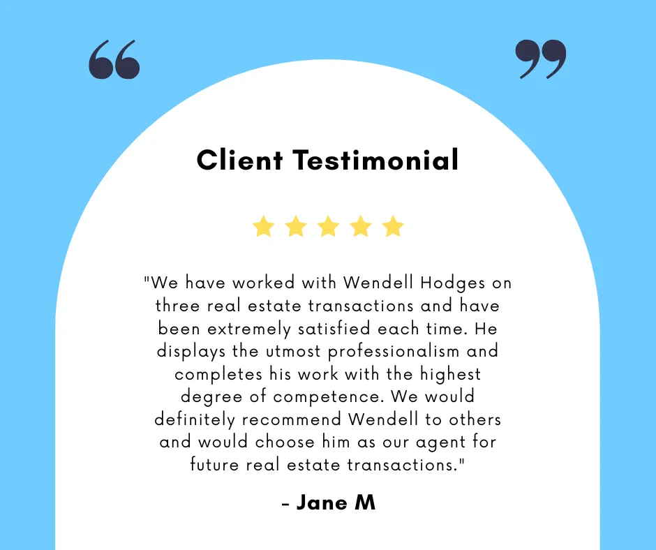 "We have worked with Wendell Hodges on three real estate transactions and have been extremely satisfied each time. He displays the utmost professionalism and completes his work with the highest degree of competence. We would definitely recommend Wendell to others and would choose him as our agent for future real estate transactions."