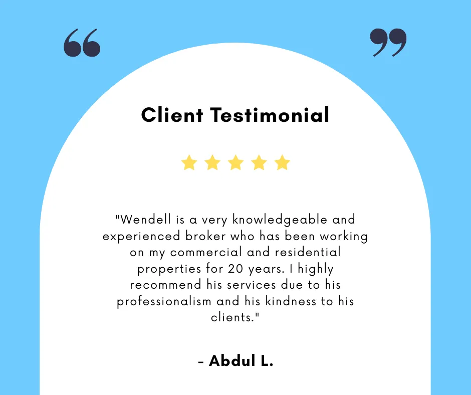 "Wendell is a very knowledgeable and experienced broker who has been working on my commercial and residential properties for 20 years. I highly recommend his services due to his professionalism and his kindness to his clients."